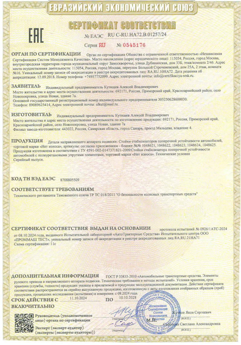 Данные изделия прошли необходимые испытания и имеют сертификат соответствия. Кроме продукции под маркой Нет износа, на нашем сайте представлена продукция производителей полиуретановых деталей подвески под марками «Полиуретан» и «Точка опоры». Это сделано для удобства покупателей, сопутствующие товары можно приобрести в одном месте.